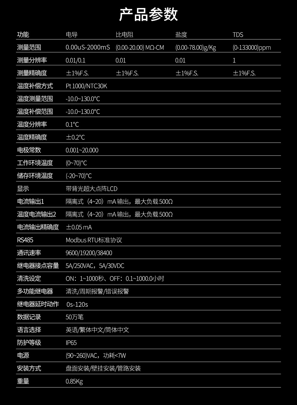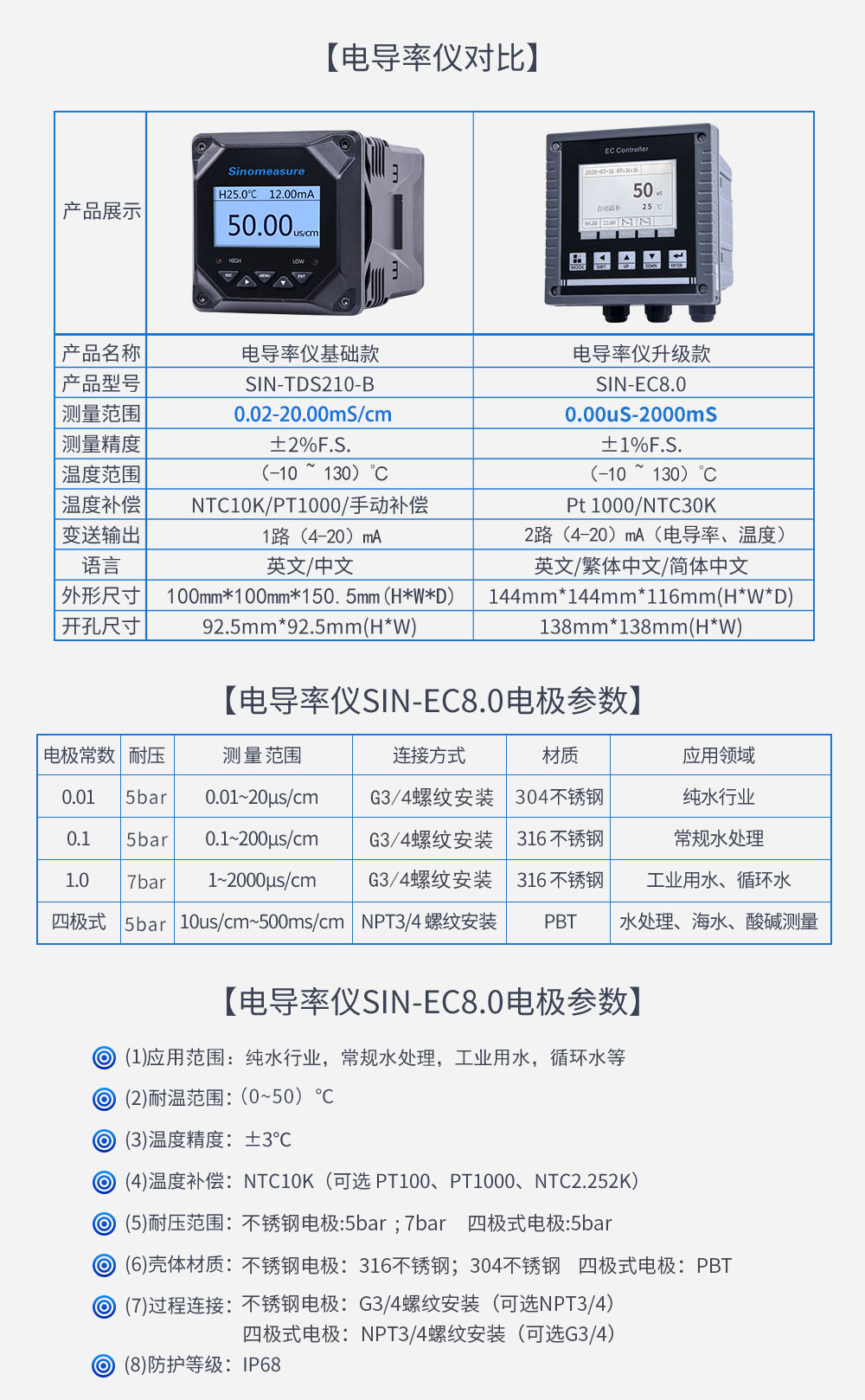 聯(lián)測(cè)儀表SIN-EC8.0用于工業(yè)上電導(dǎo)/比電阻/鹽度/溶解固體總量及溫度的測(cè)量,如: 廢水,純凈水,環(huán)境監(jiān)測(cè),食品生產(chǎn)過程等,儀器可以盤面安 裝,壁掛安裝,管路安裝。儀器提供 2 路電流輸出,最大負(fù)載為 500Ω, 儀器提供 3 路控制用繼電器,繼電器最大承受電壓及電流為 5A/250VAC 或 5A/30VDC。