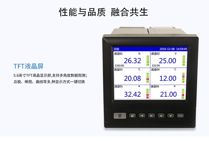 SIN-R4000D系列無紙記錄儀可自由組態輸入標準電流、標準電壓、熱電偶、熱電阻、頻率等信號,可實現為傳感器配電和繼電器報警輸出,并且可通過U盤或通訊方式與上位機進行數據交換。無紙記錄儀本身具有實時數據顯示畫面、曲線顯示畫面以及棒圖數據顯示畫面,同時,可以與微型打印機相連接,實現現場打印功能,與聲光報警器連接,實現現場聲光報警功能。
