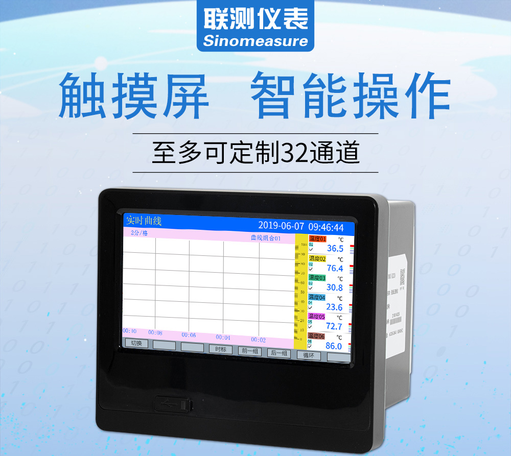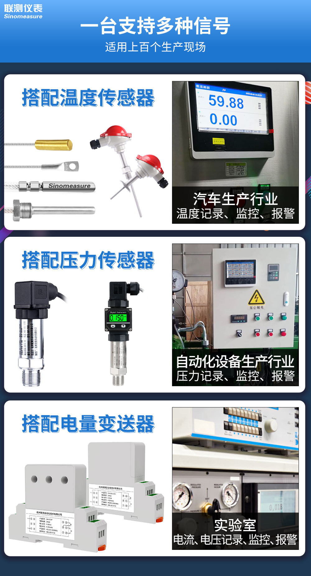 8路萬能信號輸入(可組態選擇輸入:標準電壓、標準電流、熱電偶、熱電阻、毫伏等)。可帶4路報警輸出,1個饋電輸出,RS485通訊接口,以太網接口,微型打印機接口和USB接口,SD卡插座;具有強大的顯示功能,實時曲線顯示,歷史曲線追憶,棒圖顯示,報警狀態顯示。