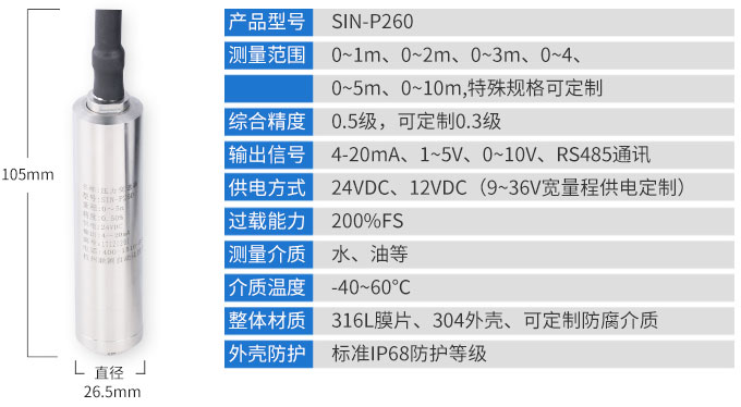 SIN-P260投入式液位變送器SIN-P260投入式液位變送器由高性能擴(kuò)散硅壓阻式壓力傳感器作為測量元件,把與液位深度成正比的液體靜壓力準(zhǔn)確測量出來,并經(jīng)過信號調(diào)理電路轉(zhuǎn)換成標(biāo)準(zhǔn)(電流或電壓)信號輸出,建立起輸出信號與液體深度的線性對應(yīng)關(guān)系,實(shí)現(xiàn)對液體深度的測量。產(chǎn)品精度高、體積小,直接投入液體中,即可測量出變送器末端到液面的液體高度,使用方便。適用于石油、化工、電廠、城市供水、水文勘探領(lǐng)域的液位測量與控制。經(jīng)過長期老化及穩(wěn)定性篩選,產(chǎn)品性能穩(wěn)定可靠,能夠適用應(yīng)用于環(huán)境比較惡劣的露天現(xiàn)場,同時能夠現(xiàn)場液位顯示,零點(diǎn),滿程可遷移。